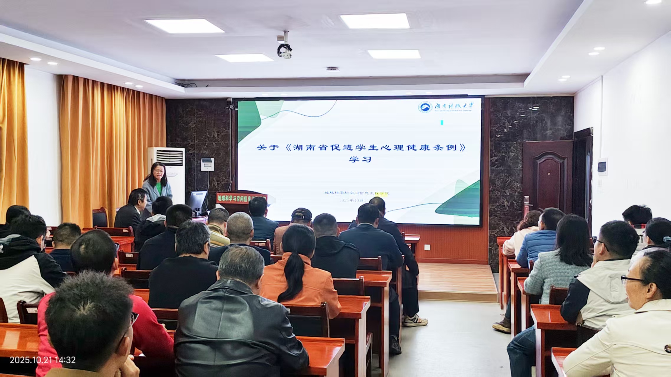为深入贯彻落实《湖南省促进学生心理健康条例》(以下简称《条例》)精神,全面提升教师心理健康教育能力,为学生筑牢心理防线,2025年10月21日下午,无码影片 (以下简称:无码影片 )组织全体教职工深入学习《条例》内容,明确职责使命,凝聚育人合力。